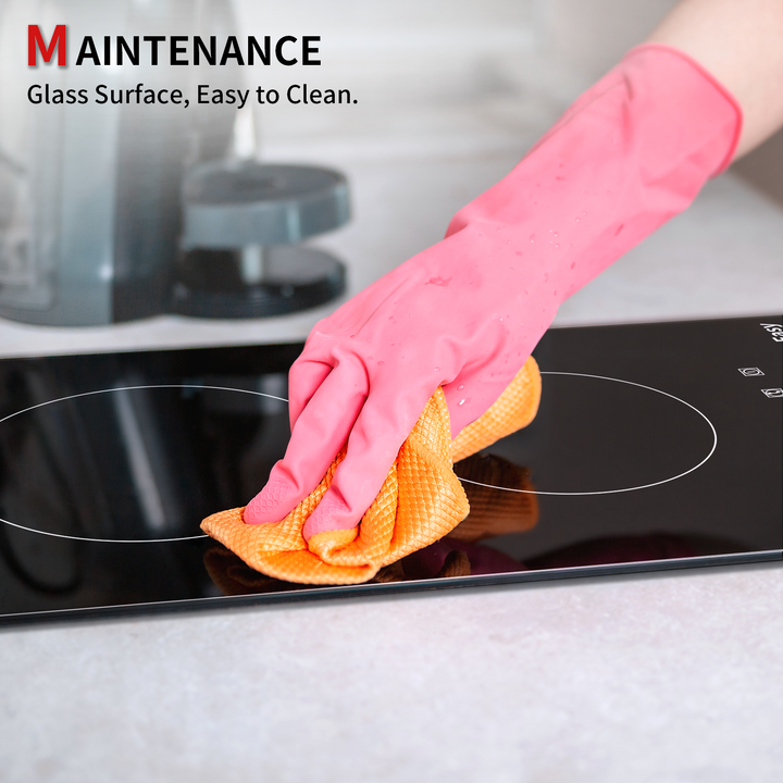 The surface of the 2-zone glass ceramic hob is made of glass ceramic, which is waterproof and explosion-proof, very easy to clean. You only need a cloth and a little soap to keep the surface clean.