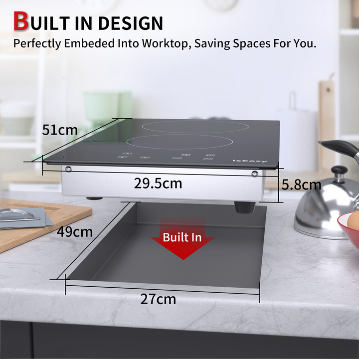 2-Zone Cooktop: 1200W and 1800W burners, fast heating, 220-240V.