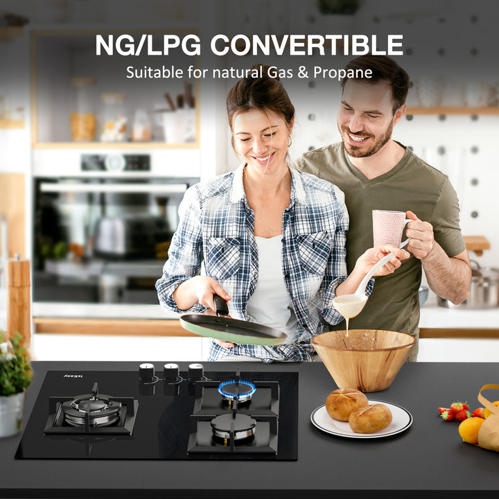 - Installation: the built-in self-sufficient glass 3 gas stove is a plug and play device. Natural gas (20 mbr)/propane gas (30 and 50 mbr). The basic setting is for natural gas and there are two sets conversion kit for propane gas (30 and 50 mbr).