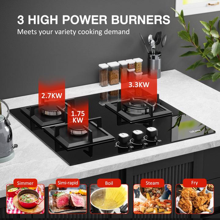- Up to 7750 W. The glass gas hob 3 flames has 3 highly efficient sealed burners with 3.3 kW + 2.7 kW + 1.75 kW. The 3-burner gas hob meets your daily cooking needs.