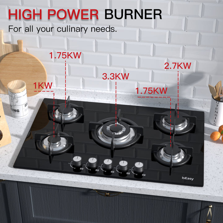 IsEasy 30" Glass Gas Hob, 5 Burners, Built-in, NG/Propane Convertible, Up to 10.5 kW, 5 Zones, Black Glass