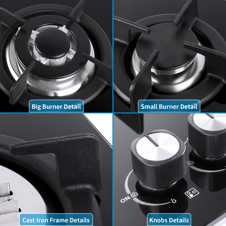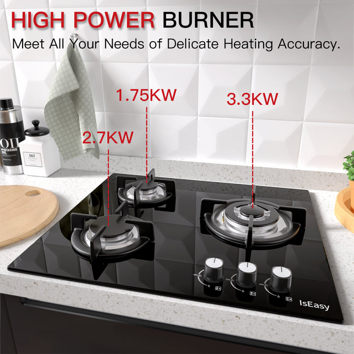 IsEasy 24" Glass Gas Hob, 3 Burners, NG/Propane Convertible, Automatic Thermocouple Protection, Built-in, 1.75 KW/2.7 KW/3.3 KW