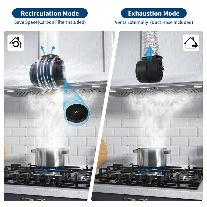 600 CFM Airflow: 30-inch range hood with 3-speed fan, 65dB max noise, and ducted/ductless options. Includes charcoal filter and vent hose.
