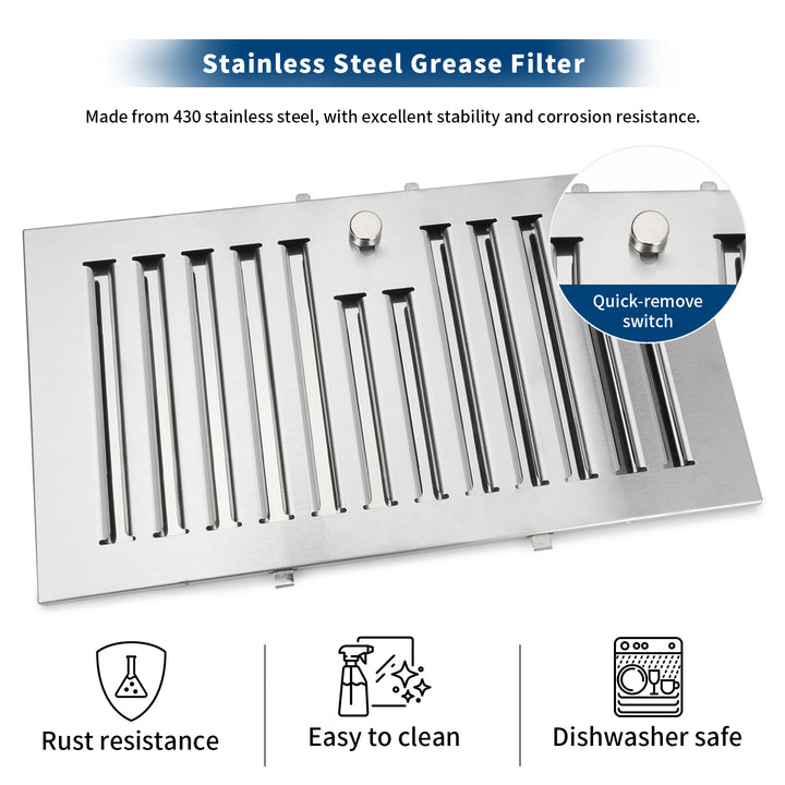 #430 stainless steel: With good corrosion resistance, can be used many years. This stainless steel baffle filter is designed with deep grooves to efficiently collect cooking grease. Its easy-to-remove and clean design allows you to reuse it forever just by putting it in the dishwasher.